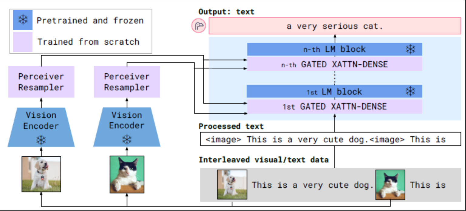 기존의 많은 멀티모달 모델들이 텍스트와 이미지 데이터를 처음부터 함께 학습시키는 방식을 취했다면, Flamingo는 사전학습된 Vision Encoder와 대형 언어모델(LLM)을 고정한 채, 그 사이에 새로운 레이어를 삽입하여 이미지 정보를 텍스트 생성 과정에 주입하는 방식을 사용합니다. 이를 통해 기존 LLM이 가진 강력한 언어 능력을 손실 없이 그대로 활용하면서도, 시각 정보를 조건으로 통합할 수 있습니다.
