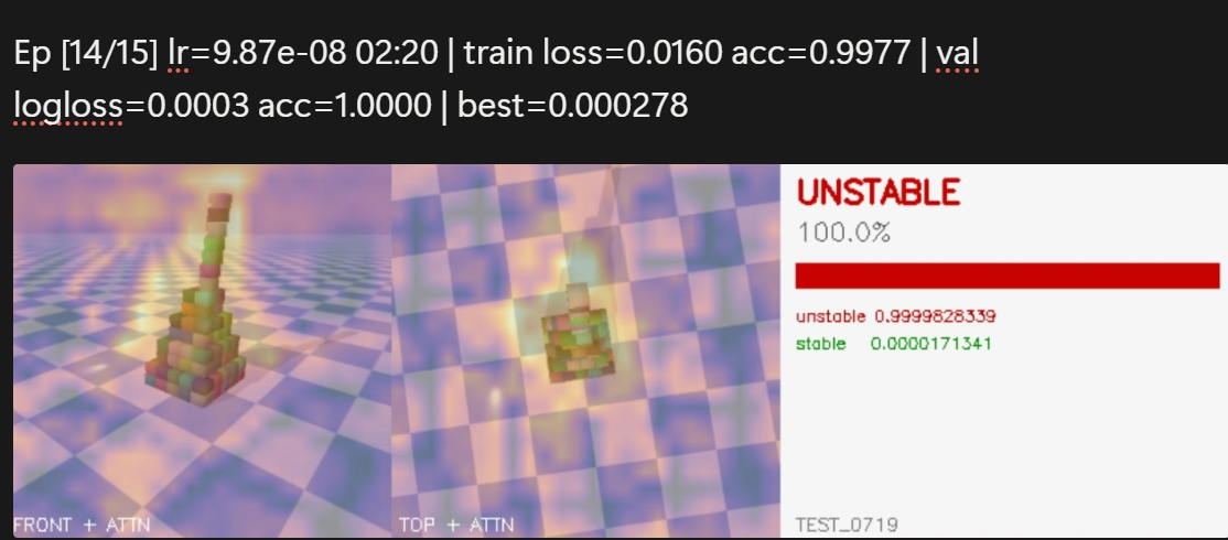 검증 셋(Val)에는 그냥 탑의 전체적인 모양이나 너비만 대충 봐도 무너질지 통계적으로 찍어 맞출 수 있는 얕은 패턴이 있었을 거다. 실루엣 따기에 미친 DINO는 이 패턴을 완벽히 외워버려서 Loss를 쫙 낮춘 거다.